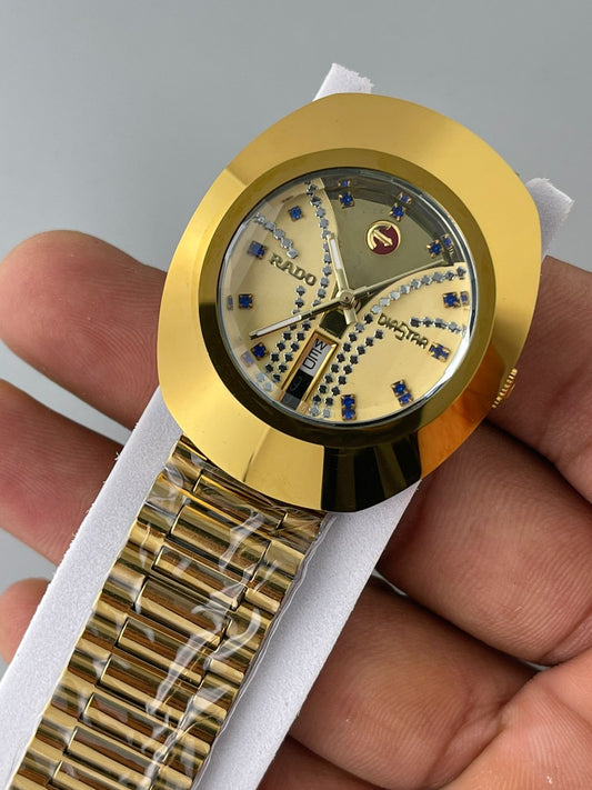 Rado Round Diastar R-124130672 Automatic Analog Gold Strap Date Men's Watch With Yellow Gold And Gold Diamond Dial Round Classic Formal Party Wear For Men's