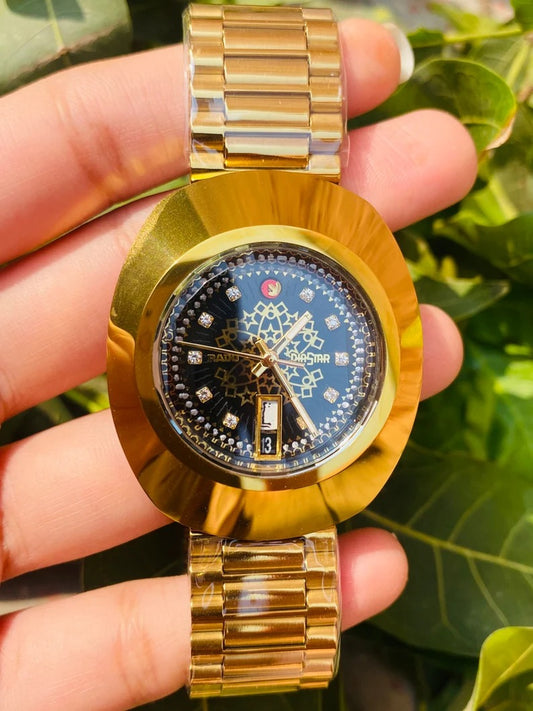 Rado Round Diastar R12413075-5 Automatic Analog Gold Strap Date Men's Watch With Black Dial Classic Formal Party Wear for Men's