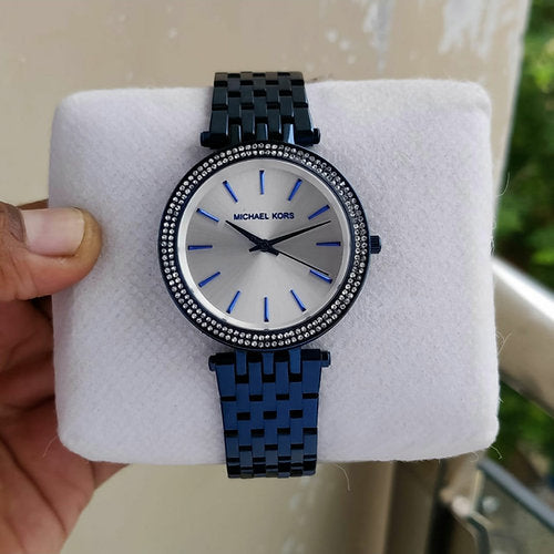 Branded Silver Dial Women's Watch With Blue Color Strap Watch And Diamond Case For Women's or Girl MK-8824 Analog Dial Women's Or Girls watch