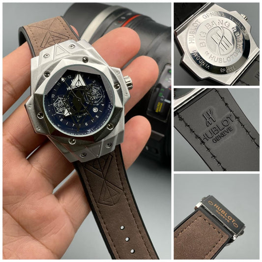 Hublot Sang Analog Mens Watch Silver Case Black Dial With Brown Leather Belt Watch For Man HB-BB-201