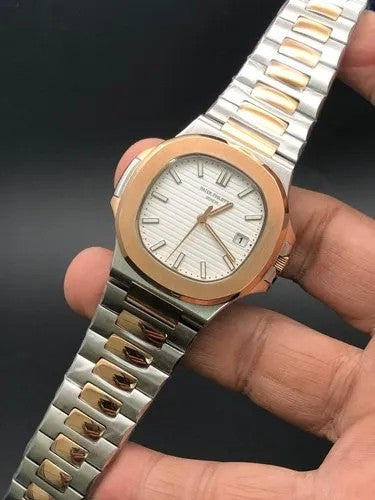 Patek Philippe Nautilus Mad Watch Quartz Movement White Dial Silver And Rosegold Strap Dated Watch For Men's-Best Men's Collection PP-7156