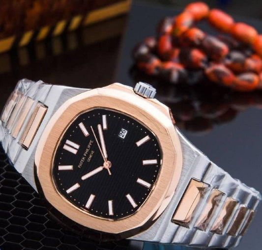 Patek Philippe Nautilus Mad Watch Quartz Movement Black Dial Silver And Rosegold Strap Dated Watch For Men's-Best Men's Collection PP-2465