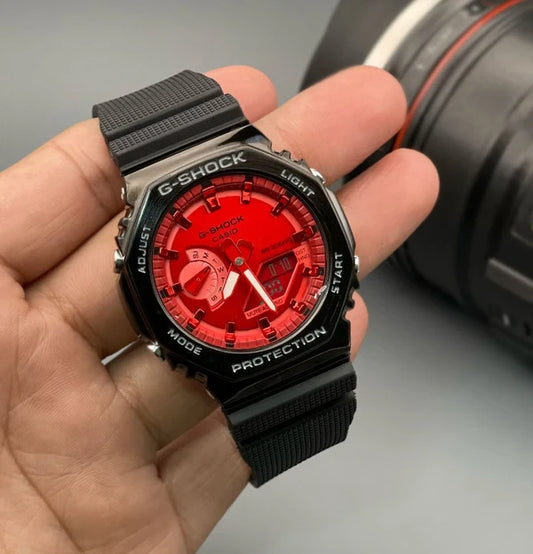 G-shock Metal Covered Red/Black Round Analog+Digital World Time Multi-Function Resin Band Sports Watch GS-2102