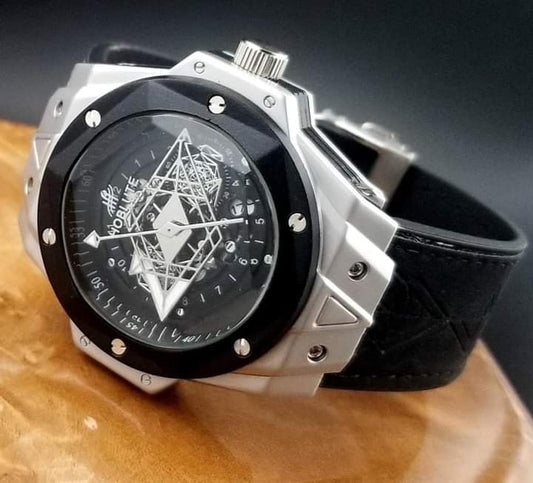 Hublot Latest Collection II All Black Chronograph Watch With Black Analog Mens Watch Black & Silver Case Black Dial With Leather Belt Watch For Man HB-BB-6689