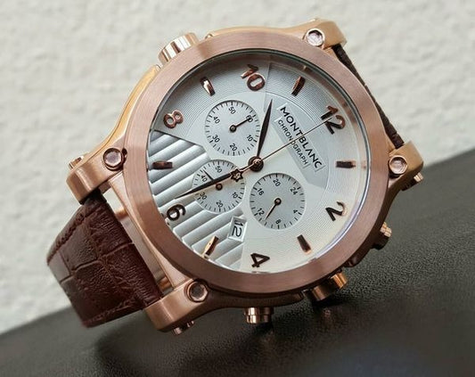 Mont Blanc White Color Dial Chronograph Leather Strap Watch With Rose Gold Color Case Watch For Men's- Best Watch For Men's For Formal Look Mb-9016