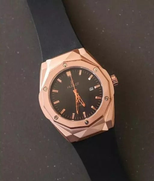 Hublot Latest Collection Rose Gold Analog Watch For Men's With Black Dial Leather Belt Watch HB-RGB-4564