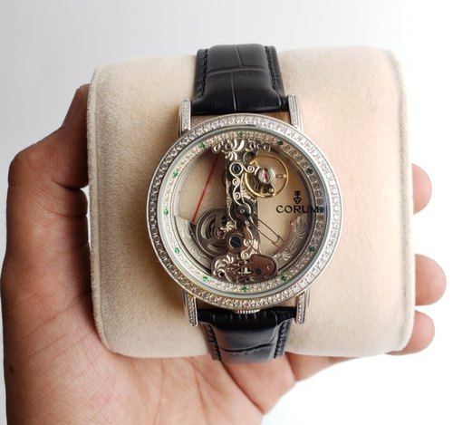 Corum Automatic Watch Good Quality Round Diamond Dial Black Leather Watch For Man- Best Gift
